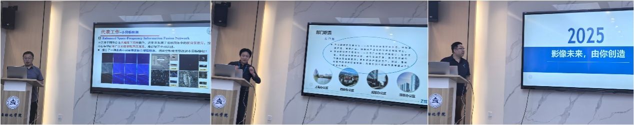 交流环节,中兴通讯招聘调配总监李浩通过详实数据,肯定了我校毕业生在中兴通讯的职业发展良好态势,并介绍了中兴通讯最新招聘需求。随后,智能科学与技术系主任姚西文教授、李晖晖副教授和夏辰副教授分别介绍了团队主要研究方向、研究成果等情况。中兴终端影像算法部部长崔小辉、软件技术总工于峰分别就影像及软件部门骨干业务、技术发展情况进行了介绍。随后,双方重点围绕终端软件和影像技术,包括计算机视觉、计算摄影、图像处理、多模态算法等契合方向进行了深入探讨与交流。