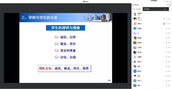 王小旭教授就研究生招生、培养、授予学位等关键环节的校院两级相关文件制度进行了详细解读,着重介绍了导师在研究生培养各个环节应如何落实第一责任人职责,如何把好培养质量关,如何增进导学关系。同时,以学院一流研究生人才培养行动计划为落脚点,强调了研究生导师要在落实一流行动计划中发挥关键作用,为学院培养一流人才添砖加瓦。