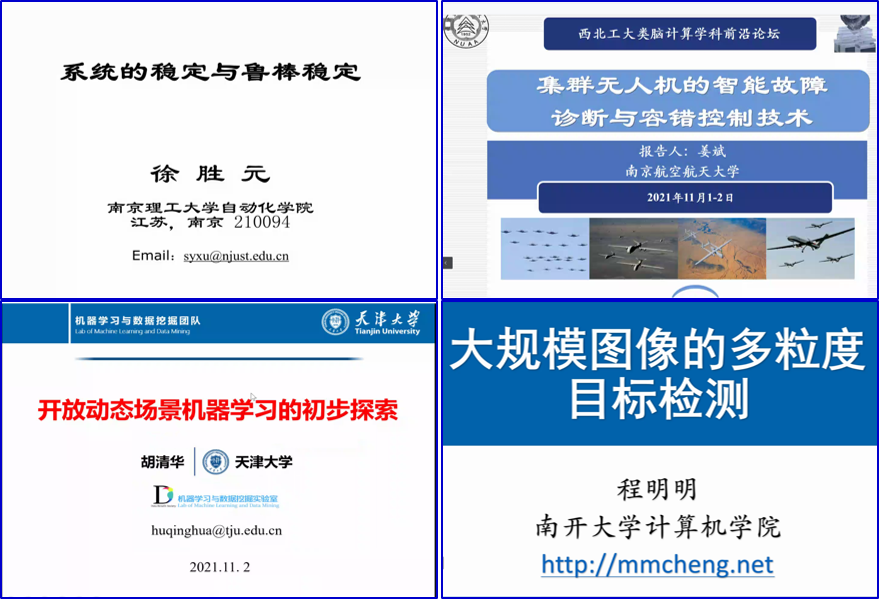 南京理工大学徐胜元教授分享了题为“系统的稳定与鲁棒稳定”的报告;天津大学胡清华教授分享了题为“开放动态场景中的自主机器学习探索”的报告;南开大学程明明教授分享了题为“大规模图像的多粒度目标检测”的报告;南京航空航天大学姜斌教授分享了题为“集群无人机的智能故障诊断与容错控制技术”的报告。