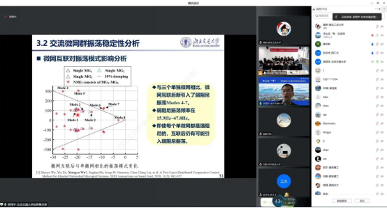 本场论坛专家报告分上午、下午两场。上午场由刘文杰、黄明两位副教授主持。浙江大学杨永恒研究员作“电力电子在大规模新能源发电系统中的应用”报告,分析了电力电子技术的大规模应用给传统电力系统运行带来的新挑战及应对方案。华中科技大学甘醇教授作“新型无稀土磁阻电机驱动与控制系统”报告,从电机本体、驱动及控制等方面分享了近年来在该领域的相关研究成果。北京交通大学吴翔宇副教授作“微网群运行控制和宽频振荡研究与展望”报告,梳理了微电网的运行控制问题及宽频振荡问题并给出了解决方案。武汉大学刘承锡教授作“新型电力系统宽频振荡等值弹性动力学建模理论与抑制方法研究”报告,从弹性动力学视角详细论述了在振荡建模理论及抑制方法方面的研究工作。重庆大学方斯顿教授作“海洋能源交通系统融合建模与优化”报告,探讨了船舶电气化和低碳发展趋势下的融合建模与优化方法研究。西安交通大学张海涛助理教授作“基于交直流混合导纳的交直流混联电力系统谐振稳定性分析”报告,针对不同原因引发的交直流混联电力系统振荡问题给出独立解耦的系统镇定策略。