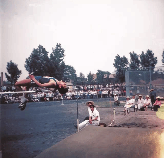 1983年在学校田径场上跳高的张晓斌(郭友军摄)