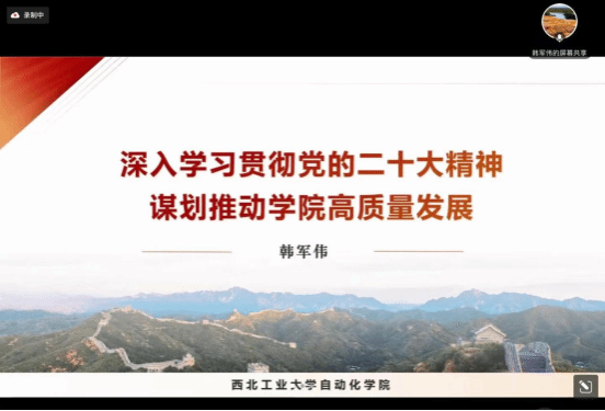 院长韩军伟以线上形式为联系支部控制理论与控制工程系党支部讲授党的二十大精神专题党课。学院党委副书记王丽、控制理论与控制工程系党支部全体党员参会。会议由支部书记陈小锋主持。