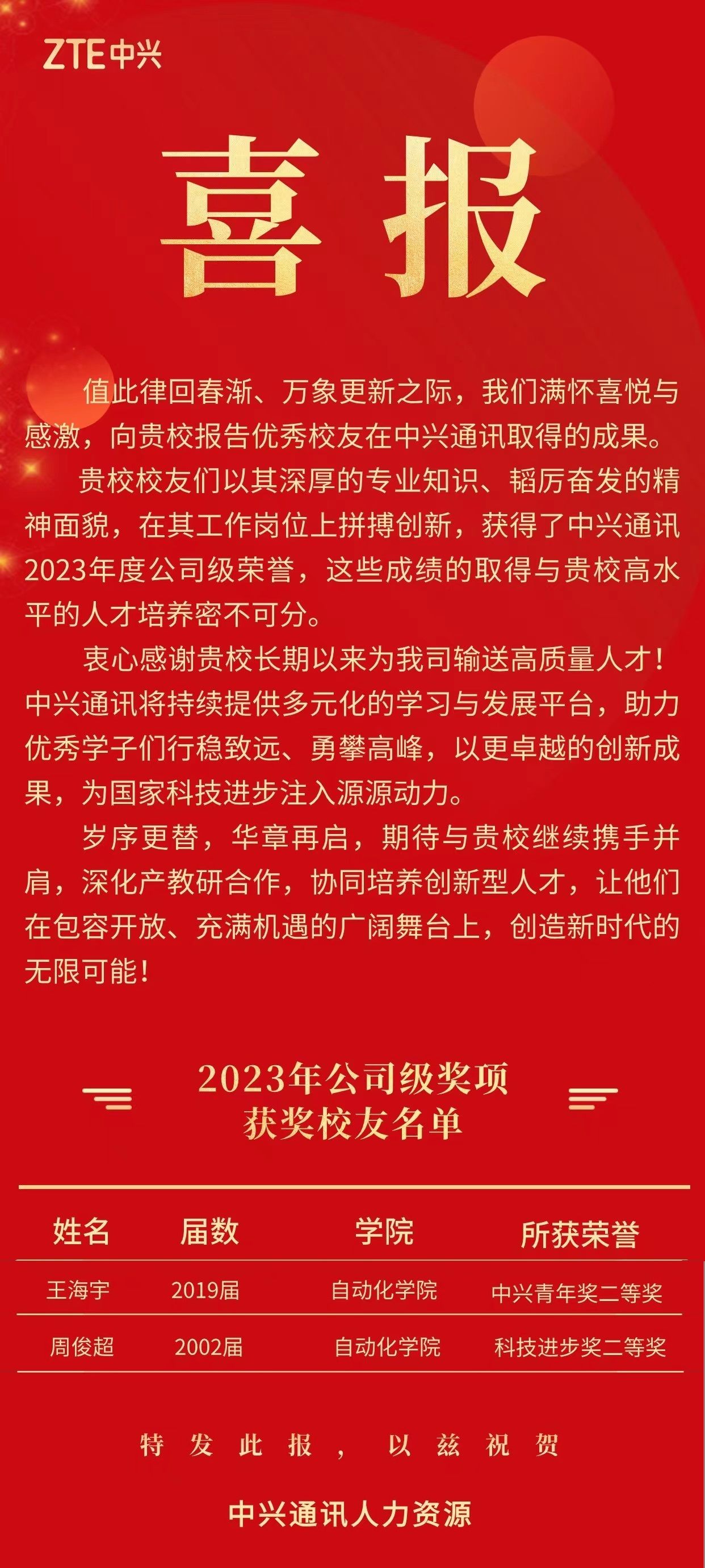 优秀院友2002届周俊超、2019届王海宇在工作岗位上拼搏创新,以其深厚的专业知识、韬厉奋发的精神面貌,荣获中兴通讯2023年度公司级荣誉。