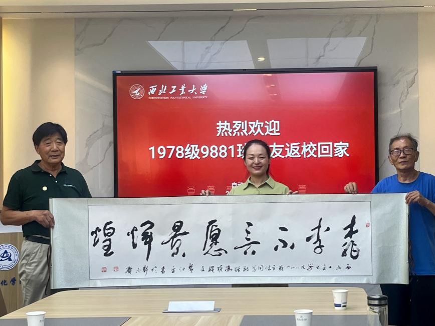 在学院341会议室,9881班全体校友为学院赠送了由冯烁校友题词、黄江平校友亲笔书写的“桃李不言愿景辉煌”八字书法作品一幅,以此表达对母校培育的感恩之情,并祝愿母院未来继续蓬勃发展、师生共筑辉煌。学院党委副书记易正阳、办公室主任魏爱玉代表学院分别接受书法赠礼,并对校友返校表示热烈欢迎和诚挚感谢,希望校友们闲暇之余常回校看看,重温青春岁月,共叙情谊、共谋发展、共话未来,让永不褪色的深情成为学院和校友间永恒的纽带和桥梁。