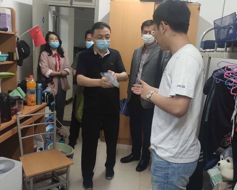 接下来,学院领导深入学生宿舍看望了首批返校的学生,并进行亲切交谈,详细询问了同学们返程情况和在校生活所需。同时,为同学们送去了个人防护用品套装,殷切叮嘱同学们严格遵守学校疫情防控管理制度,理性看待防疫举措,保持良好生活习惯,做好自身科学防护。