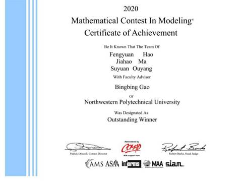 近日,2020年美国国际大学生数学建模竞赛(MCM)与交叉学科建模竞赛(ICM)成绩揭晓,我院2017级本科生欧阳苏媛所在团队荣获Outstanding Winner奖项(下称O奖),即国际特等奖,指导老师为我院青年教师高兵兵。O奖今年在中国的获奖率仅有0.2%,该团队完成的B题全球只有五支队伍获此殊荣。同时,作为我校今年唯一一支获得O奖的队伍,实现了近三年来我校在该赛事中一次新的突破。