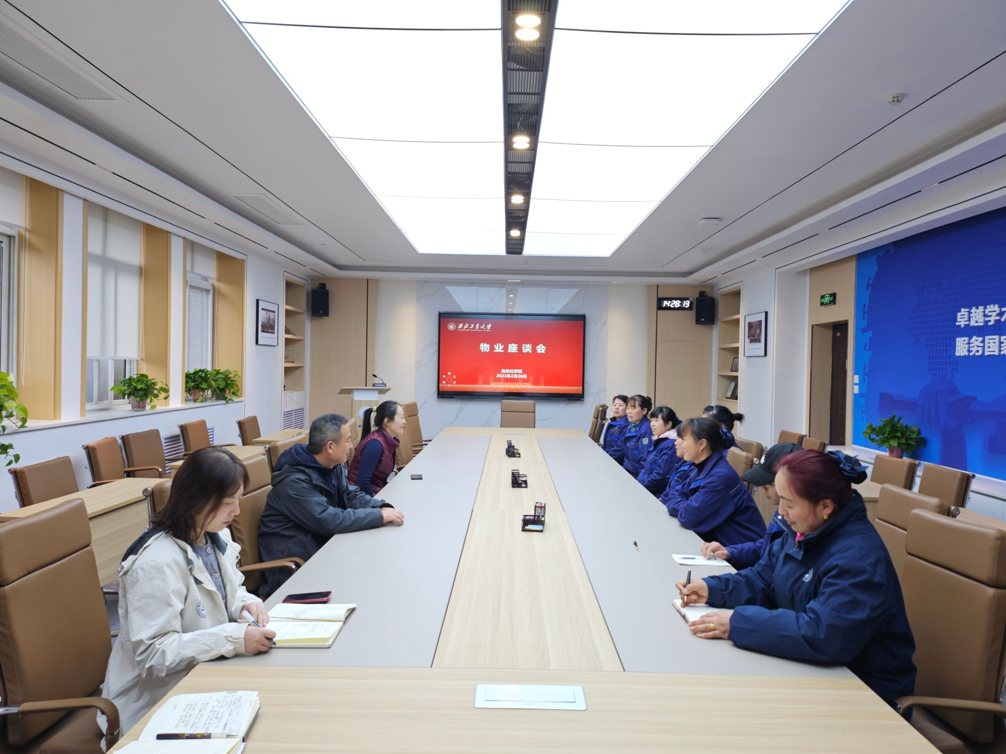 学院办公室与后勤物业人员召开2024年新学期物业服务座谈会。办公室主任魏爱玉对后勤物业辛勤付出表示诚挚感谢,并重点围绕学院楼宇消防安全、环境保洁、日常维护等事项提出相关需求,希望物业持续提高服务水平与工作质量,配合办公室做好学院后勤服务保障工作,携手打造宜学、宜业的一流学院环境。