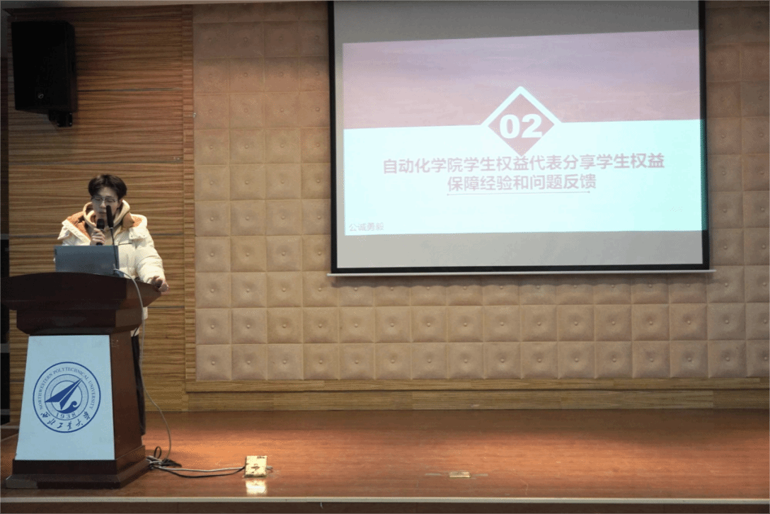学生权益代表王赛博分享了学生权益保障的经验和问题反馈。自学院首届学生权益代表大会举行以来,学院内外在多个方面都取得了显著的改善成果。他表示,权益工作与同学们的生活息息相关,作为权益代表,应当密切关注同学们的权益问题,积极回应同学们的需求和关切,真正做到急同学之所急,想同学之所想。