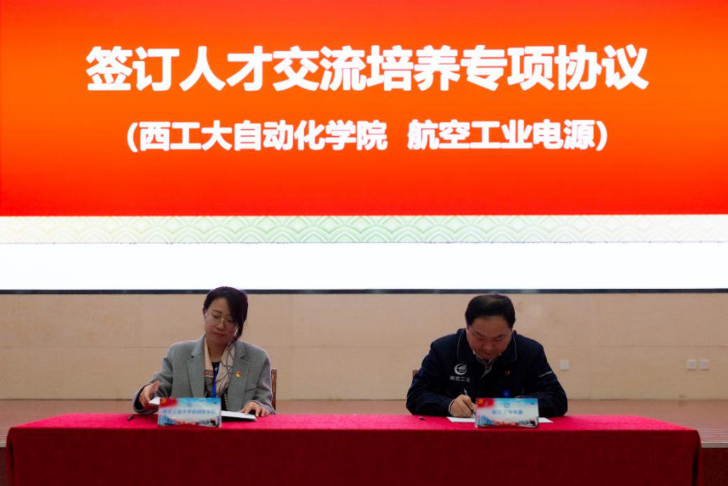党委副书记马玥和陕西航空电气有限公司总工程师、副总经理蒙海鹰代表双方签订人才交流培养专项协议。
