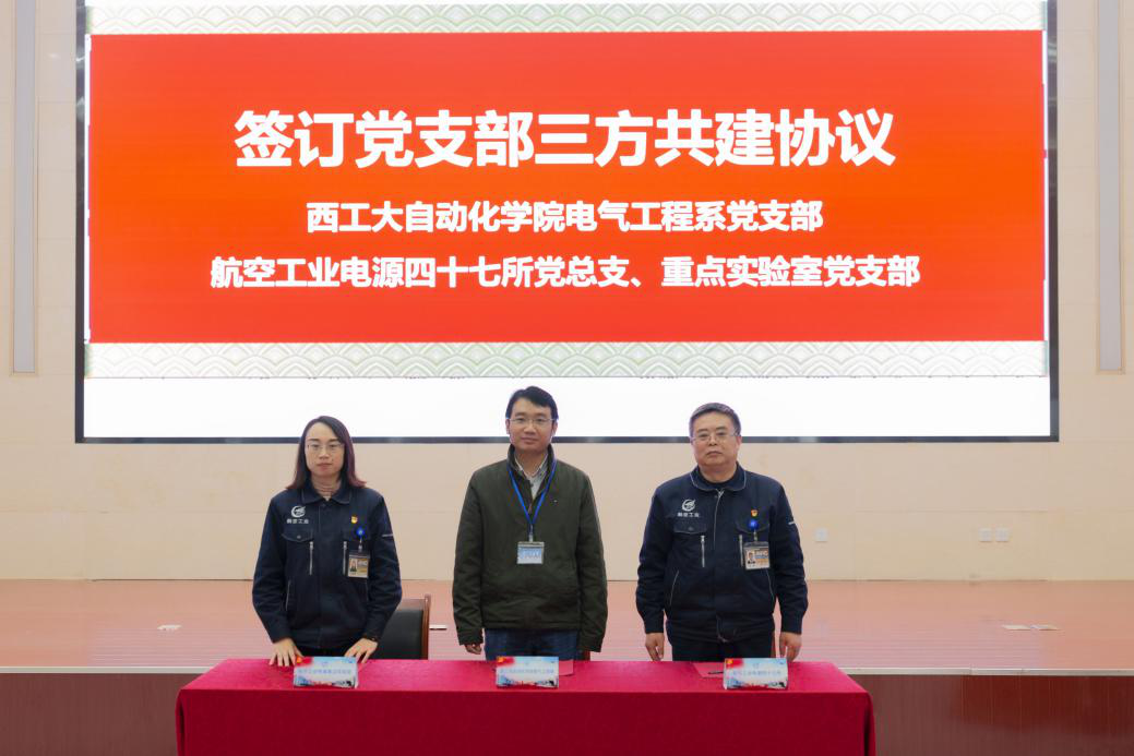 电气工程系党支部书记付朝阳和陕西航空电气有限公司四十七所党总支书记商征、重点实验室党支部书记段晓丽签订三方共建协议。