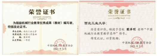 此次奖项由中国机械工业教育协会(国家一级协会)组织评定,是面向全国机械类高校及企业教育工作者的最高荣誉之一。“教育教学名师”和“优秀成果(教材)一等奖”两项荣誉的斩获,既是对樊教授在机器人工程教学领域贡献的肯定,也是学院深化教育教学改革、创新人才培养的重要标志性成果。