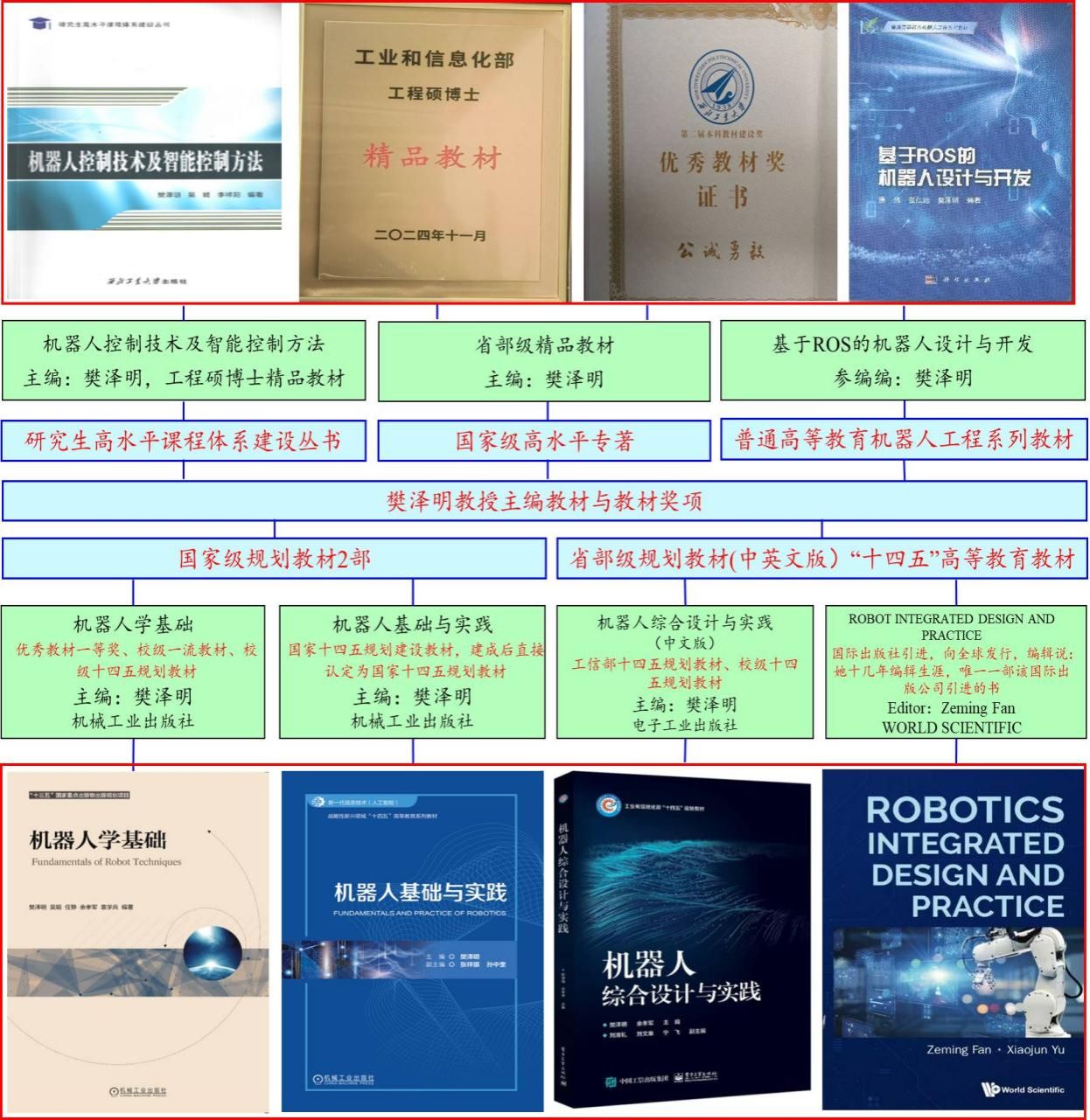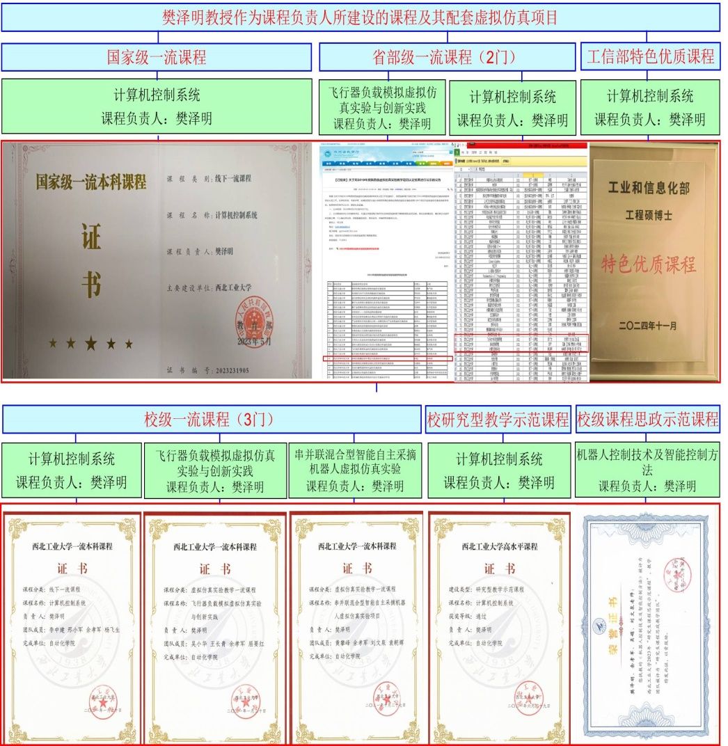 在教学方面,樊教授开发了基于“互联网+数字孪生+AI技术”的线上线下混合式教学平台,以此为支撑,课程负责人建设:国家级一流课程1门、省级各类一流课程3门、校级各类一流课程6门;第一主编:教材6部和教改专著3部,其中,中国机械行业优秀教材一等奖(最高奖)、国家重点出版物出版项目2部、国家战略新兴领域“十四五”规划教材1部(直接参评国家“十四五”规划教材)、已推荐参评国家“十四五”规划教材1部、国际著名出版社出版英文教材1部、工业和信息化部精品教材1部、工业和信息化部“十四五”规划教材1部,国家出版基金项目专著1部;专业负责人主持:《机器人工程》专业建设与改革,获国家级一流专业,2023年软科评级“A+”和软科排名全国“第六”;第一完成人获得:省级教学成果一等奖1项、校级教学成果奖6项;第一完成人获得:省级以上教学竞赛奖20余项,其中全国高校教师教学创新大赛荣获一等奖(本次大赛,全国高校一等奖只有12项、二等奖40项、三等奖197项,该奖项为陕西省唯一一等奖);第一完成人获得:中国机械行业教育教学名师、校级卓越名师奖等教学荣誉奖10余项;负责人获得:优秀教学研究一等奖2项、西部联盟竞赛奖1项、优秀基层教学组织奖1个和课程思政示范课程团队1个。
