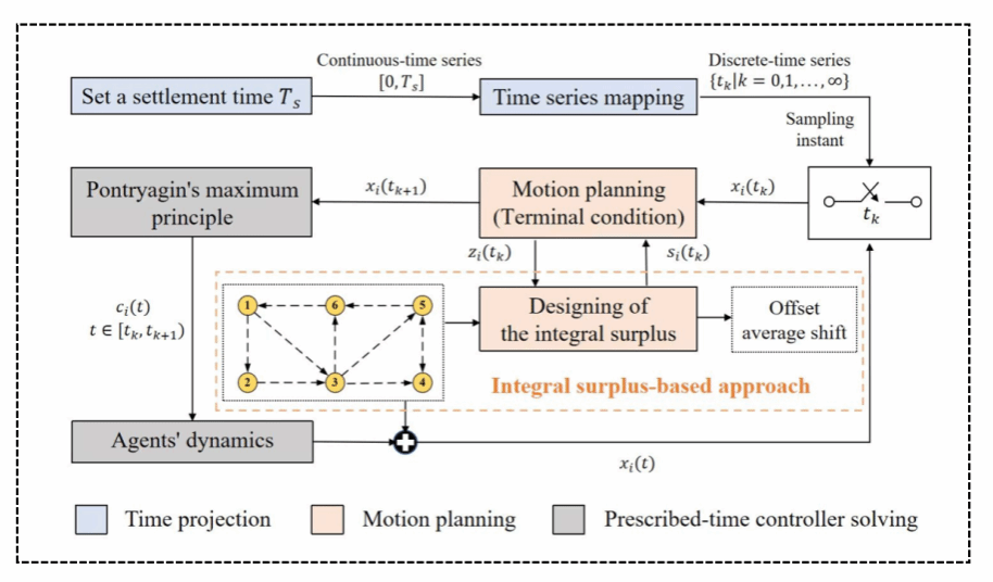 考虑到集群协同中的通信安全问题,团队研究了隐私保护要求指定时间动态平均一致性的问题,首次提出“积分盈余+状态分解”的理论框架与研究方法(图1),创新地构建了有向网络上隐私保护动态平均一致性算法。成果以《有向通信网络上隐私保护指定时间动态平均一致性:一种积分盈余设计方法》(Privacy-Protected and Prescribed-Time Dynamic Average Consensus over Directed Networks: An Integral Surplus-Based Approach)为题,以长文形式发表在控制领域重要期刊IEEE Transactions on Automatic Control (IEEE TAC长文)上。论文由漫画h