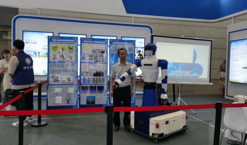 樊泽明教授与轮式仿人型机器人在第十一届陕西教博会上的合照