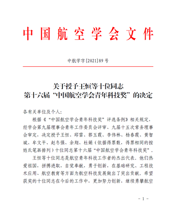 2021年11月3日,中国航空学会正式公布《关于授予王恒等十位同志第十六届“中国航空学会青年科技奖”的决定》文件,漫画h
