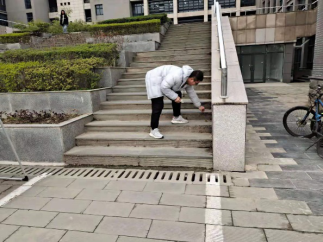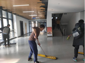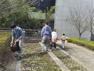 在餐厅楼下,宿舍楼层,部分志愿者正在对落叶和生活垃圾进行细致地清扫,营造了干净卫生的校园环境。