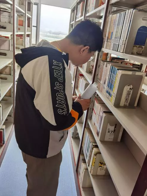 长安校区图书馆书架上的杂物,并将错位的书摆放整齐。