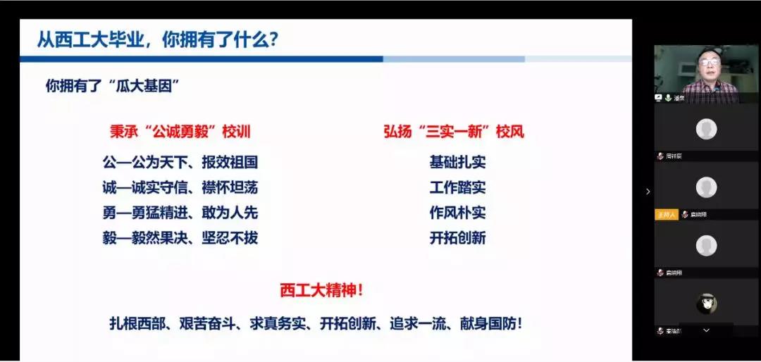 线上举办了2020届硕士毕业生“最后一课”暨2020级春季博士入学教育课,学院党委书记潘泉教授以“秉承西工大精神,争当新时代先锋”为题进行讲授。参加此次教育活动的有漫画h