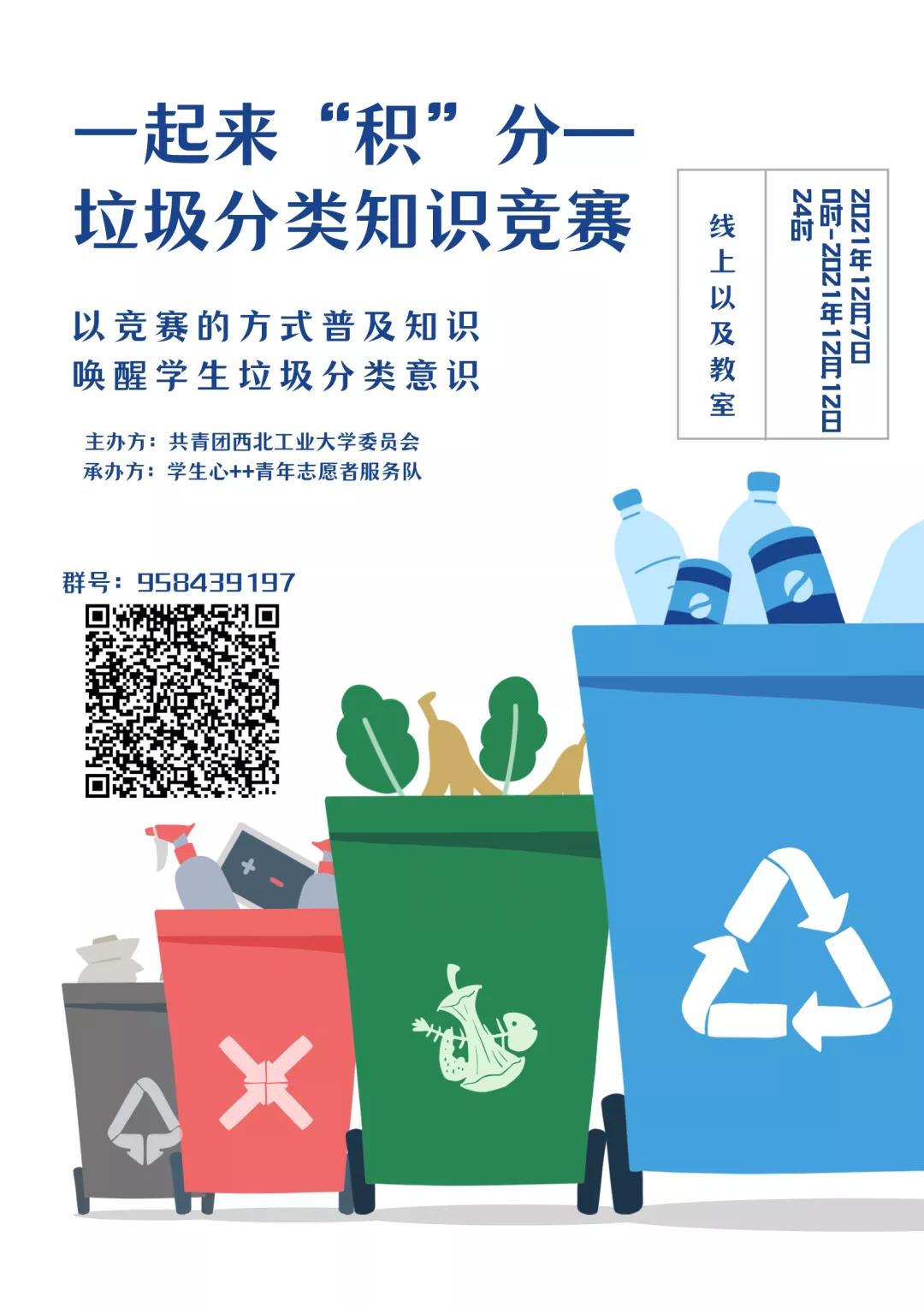 为积极响应陕西省政策号召,培养全体在校学生垃圾分类的意识,心++青年志愿者服务队于12月7日至12月12日开展了一起来“积”分—垃圾分类知识竞赛,本次活动的主题是以竞赛的方式普及知识,唤醒学生垃圾分类意识。